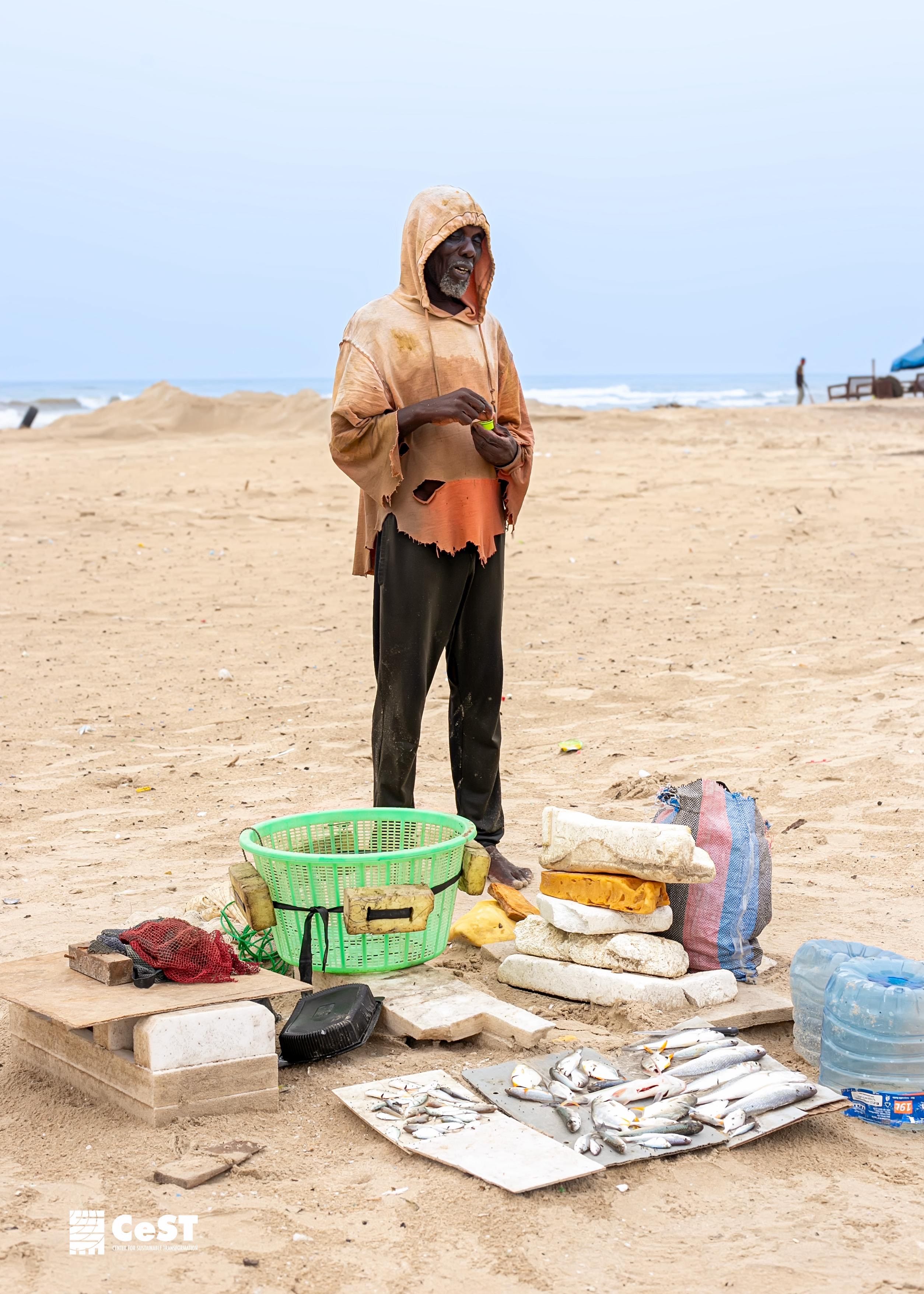 These reflections were deepened through an encounter with a local fisherman sitting at the edge of the Labadi Lagoon and the ocean. With the help of a Kinbu student translating fromGa to English, he explained that he had been fishing at Labadi since the 1970s. Ten years ago, fishing for a few hours early in the morning would fill his basket. On this day, after fishing since 3 a.m., his catch by late morning was minimal.