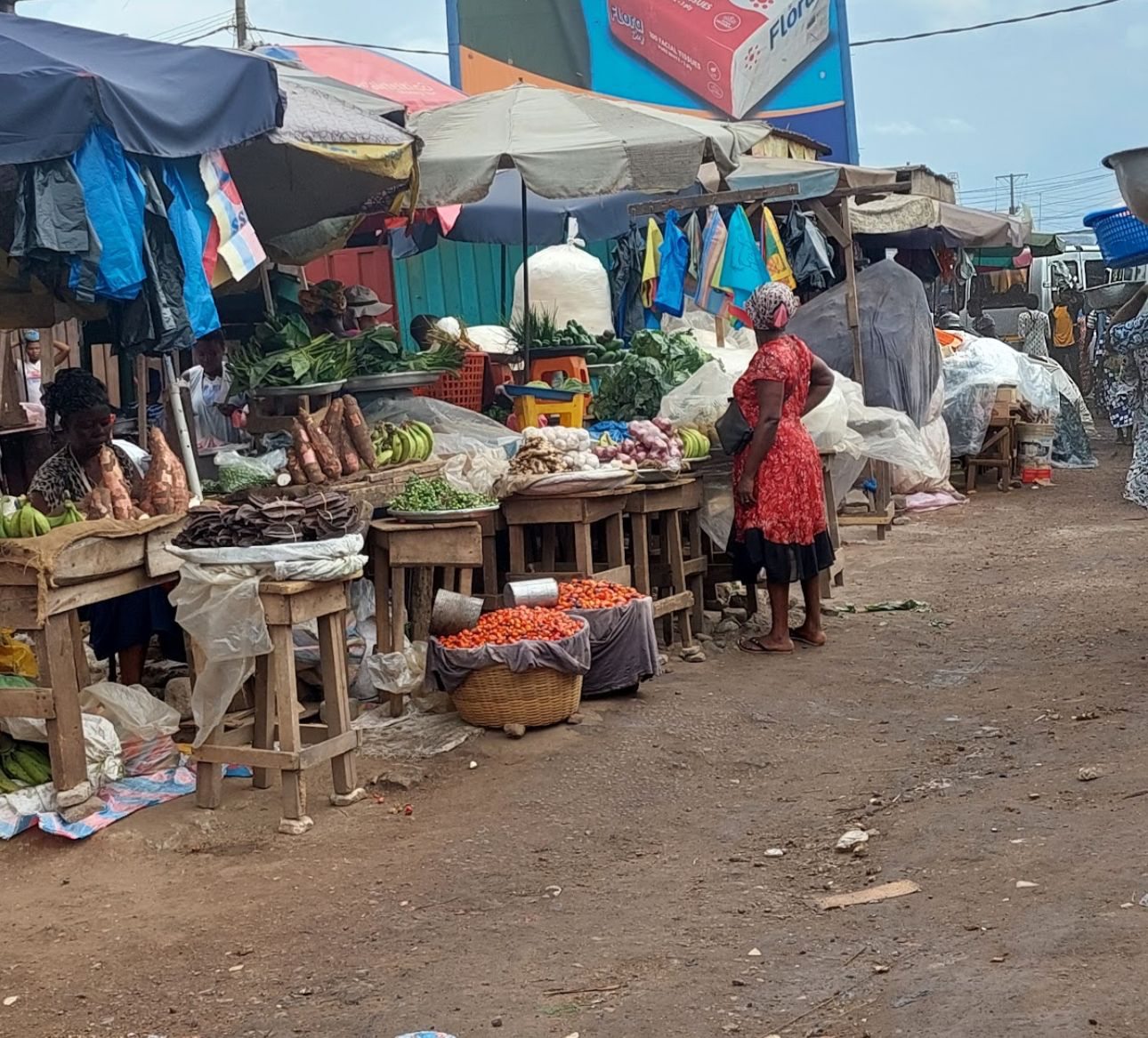 In Ghana, market centres serve as a crucial economic avenue for the transaction of goods and services. Madina market is one of the markets situated in the heart of the Greater Accra Metropolitan Area (GAMA), known for its unique diversity of goods and services. At Madina Market, vendors present their goods in varied ways; while some can afford a storehouse where goods are kept and sold, others put them on bare tables with large umbrellas. Those who are not able to afford these umbrellas are also seen walking through the markets with their goods placed on their heads.